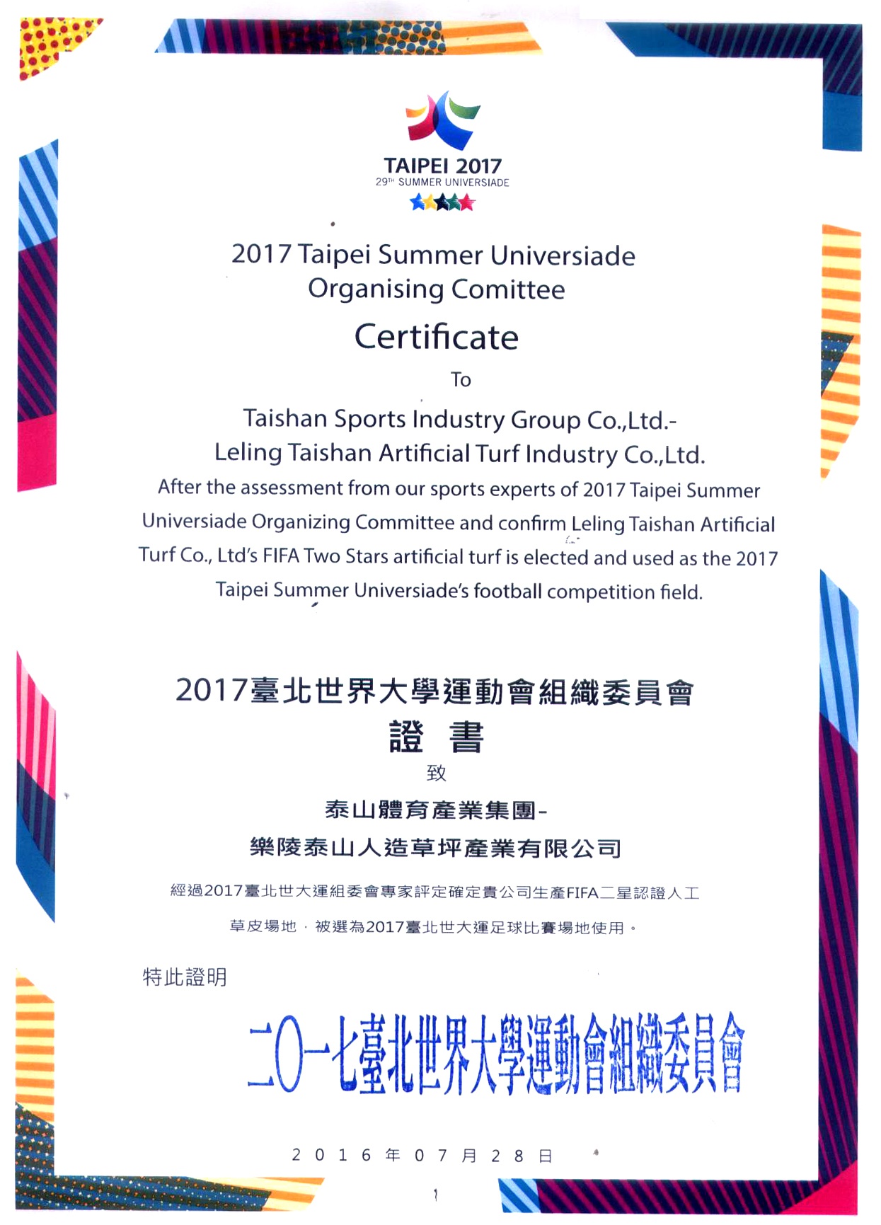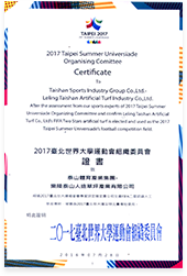 2017台北世界大学运动会组织委员会证书致乐陵凯发(K8)人造草坪产业有限公司